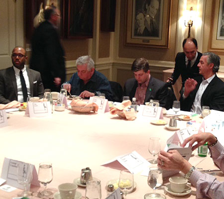 | Above 2014 Awardee and new Green member Bonnie Hagen, Green Member Marc Karell, guests Peter Reiss (IceTone) and Peter Riolo (Brown Harris Stevens), Below new Green member Tom Grech of 2014 Awardee CCI Energy and guest George Crawford (Green Partners). |